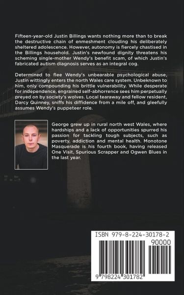 ''Monotone Masquerade is a savage read, swinging between painfully funny observations and painfully tragic consequences that are all too real-highly recommended.'' - Rose Auburn Once you're a company asset, there's no cheap way out. ----------------------------------------------------------------------------------------------------------------------------------------------- Fifteen-year-old Justin Billings wants nothing more than to break the destructive chain of enmeshment clouding his deliberately sheltered adolescence. But Justin's newly found dignity threatens his scheming single-mother Wendy's benefit scam, of which his fabricated autism diagnosis serves as an integral cog. Determined to flee Wendy's unbearable psychological abuse, Justin wittingly enters the North Wales care system, where engrained self-abhorrence ensures he's vulnerable to the unforgiving surroundings. Feral budding drug dealer and fellow resident Darcy Quinney sniffs his diffidence from a mile off and gleefully assumes Wendy's puppeteer role. ----------------------------------------------------------------------------------------------------------------------------------------------- ''George Veck's storytelling prowess is on full display as he immerses readers in a chilling world of manipulation, vulnerability, and the pursuit of freedom. This gripping tale is a testament to Veck's ability to craft a narrative that leaves a lasting impact, making it a must-read for those seeking a compelling and unsettling crime novel.'' - Goodreads review ''Once again, Veck offers an authentic, gritty, and gripping slice of North Wales's societal underbelly. Monotone Masquerade is a savage read, swinging between painfully funny observations and painfully tragic consequences that are all too real-highly recommended.'' - Rose Auburn ''A masterful telling of a young man's struggle to survive in the modern world. Child abuse is always a difficult topic and George Veck handled it with professionalism and humanity.'' - Madalyn ''I liked how relatable the characters were, and how accurate the struggles were especially when they feel lost. It calls back to the environment in my own community and how, despite all the "help" around, people still lose their way.'' -. Robin Goodfellow ''I definitely recommend this book, also to people who went through hardship, had a horrendous childhood or had their own pile of serious struggles.'' ''If you're looking for a coming of age story that paints a very real picture of what some youth must walk through, definitely join Justin on his journey to find real love and care in Monotone Masquerade!'' - Joshua Grant