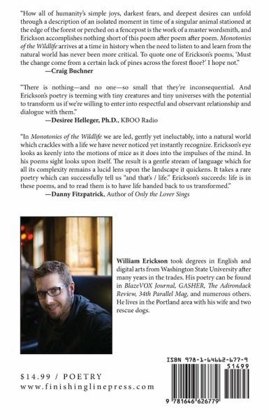 Monotonies of the Wildlife is a complex, surreal dialogue with the natural world: its joys, pleasures, and deepest desires whittled down to a few solitary moments of singular yet deeply interconnected animals and selves. Monotonies engages in heartfelt conversations with loss, not only of those with whom we've connected, loved, cherished, but those whom we've failed to do so. Erickson's poem "Player Piano" was long-listed for the Wildfire Words International prize in poetry and is featured in the Transformations Anthology. In its surreal environments, one loses the ability to distinguish between the self and the myriad other selves by which we are surrounded.