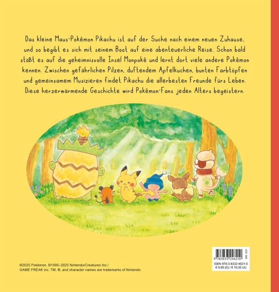 Das kleine Maus-Pokémon Pikachu ist auf der Suche nach einem Zuhause. Entdecke zusammen mit Pikachu eine geheimnisvolle Insel voller magischer Orte, fröhlicher Abenteuer und vielen neuen Freunden. Eine herzerwärmende Vorlesegeschichte mit wunderschönen Illustrationen für die kleinsten Pokémon-Fans.