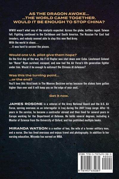 As the dragon awoke... ...the world came together. Would it be enough to stop China? WWIII wasn't what any of the analysts expected. Across the globe, battles raged. Taiwan fell. Fighting continued in the Caribbean and South America. The Russian Far East had invaders, and nobody seemed able to stop this new Red Army. With the world in chaos... ...it was hard to unravel the pieces. Would one U.S. pilot give them hope? On the first day of the war, his F-22 Raptor was shot down over Cuba. Lieutenant Colonel Ian "Racer" Ryan survived, escaped, and now had the Air Force's 6th generation fighter under him. Would it be enough to outsmart the Chinese AI defenses? Was this the turning point... ...or the end? You'll love this third book in The Monroe Doctrine series because the stakes have gotten higher than ever and it will keep you on the edge of your seat. Get it now.