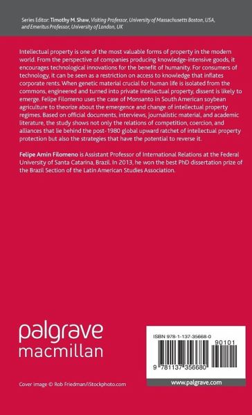 Intellectual property is one of the most valuable forms of property in the modern world. From the perspective of companies producing knowledge-intensive goods, it encourages technological innovations for the benefit of humanity. For consumers of technology, it can be seen as a restriction on access to knowledge that inflates corporate rents. When genetic material crucial for human life is isolated from the commons, engineered and turned into private intellectual property, dissent is likely to emerge. Felipe Filomeno uses the case of Monsanto in South American soybean agriculture to theorize about the emergence and change of intellectual property regimes. Based on official documents, interviews, journalistic material, and academic literature, the study shows not only the relations of competition, coercion, and alliances that lie behind the post-1980 global upward ratchet of intellectual property protection but also the strategies that have the potential to reverse it.