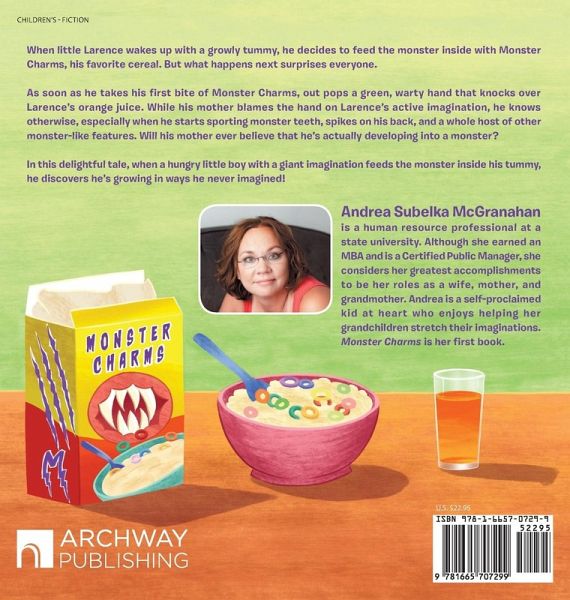 When little Larence wakes up with a growly tummy, he decides to feed the monster inside with Monster Charms, his favorite cereal. But what happens next surprises everyone. As soon as he takes his first bite of Monster Charms, out pops a green, warty hand that knocks over Larence's orange juice. While his mother blames the hand on Larence's active imagination, he knows otherwise, especially when he starts sporting monster teeth, spikes on his back, and a whole host of other monster-like features. Will his mother ever believe that he's actually developing into a monster? In this delightful tale, when a hungry little boy with a giant imagination feeds the monster inside his tummy, he discovers he's growing in ways he never imagined!