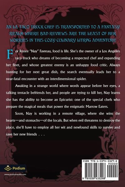 An LA taco truck chef is transported to a fantasy realm where bad reviews are the least of her worries in this cozy culinary LitRPG adventure. For Renee "Nay" Favreau, food is life. She's the owner of a Los Angeles taco truck who dreams of becoming a respected chef and expanding her fleet, and whose greatest enemy is an unhappy food critic. Always hunting for her next great dish, the search eventually leads her to a near-fatal encounter with an interdimensional spider. Awaking in a strange world where words appear before her eyes, a talking tentacle befriends her, and people are trying to kill her, Nay learns she has the ability to become an Epicurist: one of the special chefs who prepare the magical meals that power the enigmatic Marrow Eaters. Soon, Nay is working in a remote village, where she wins the hearts-and stomachs-of the locals. But when evil threatens to destroy the place, she'll have to employ all her wit and newfound skills to survive and save her new friends . . . The hit LitRPG adventure-with more than 500,000 views on Royal Road-now available on Kindle, Kindle Unlimited, and Audible!