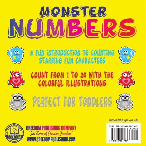 A simple, fun introduction to numbers for the youngest readers. Monster Numbers is a book that introduces young children to the world of numbers and counting. Along with bold numbers that will grab children's attention, the book also contains fun illustrations of monsters that children will be able to count and associate with each number. Your little one will love to learn about numbers and counting with this bright picture book. The interesting illustrations help children identify numbers 1 - 20. Monster Numbers is a great addition to any young reader's library.