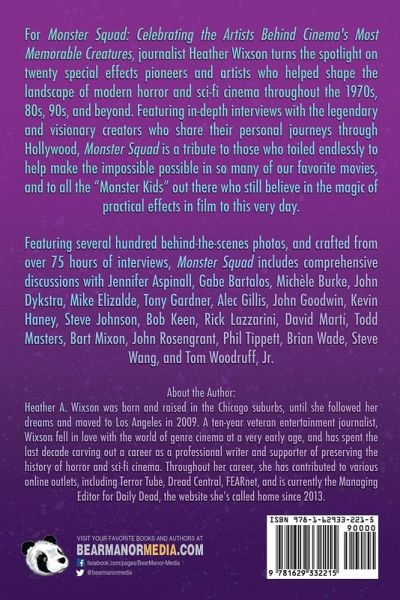 For Monster Squad: Celebrating the Artists Behind Cinema's Most Memorable Creatures, journalist Heather Wixson turns the spotlight on twenty special effects pioneers and artists who helped shape the landscape of modern horror and sci-fi cinema throughout the 1970s, 80s, 90s, and beyond. Featuring in-depth interviews with the legendary and visionary creators who share their personal journeys through Hollywood, Monster Squad is a tribute to those who toiled endlessly to helpmake the impossible possible in so many of our favorite movies, and to all the "Monster Kids" out there who still believe in the magic of practical effects in film to this very day. Featuring several hundred behind-the-scenes photos, and crafted from over 75 hours of interviews, Monster Squad includes comprehensive discussions with Jennifer Aspinall, Gabe Bartalos, Michèle Burke, John Dykstra, Mike Elizalde, Tony Gardner, Alec Gillis, John Goodwin, Kevin Haney, Steve Johnson, Bob Keen, Rick Lazzarini, David Martí, Todd Masters, Bart Mixon, John Rosengrant, Phil Tippett, Brian Wade, Steve Wang, and Tom Woodruff, Jr. About the Author: Heather A. Wixson was born and raised in the Chicago suburbs, until she followed her dreams and moved to Los Angeles in 2009. A ten-year veteran entertainment journalist, Wixson fell in love with the world of genre cinema at a very early age, and has spent the last decade carvingout a career as a professional writer and supporter of preserving the history of horror and sci-fi cinema. Throughout her career, she has contributed to various online outlets, including Terror Tube, Dread Central, FEARnet, and is currently the Managing Editor for Daily Dead, the website she's called home since 2013.