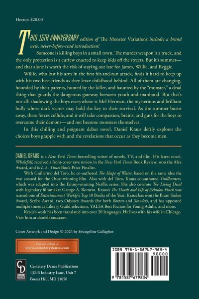 FINALLY RE-RELEASING, THIS 15 YEAR ANNIVERSARY EDITION COMES WITH A BRAND NEW INTRODUCTION! Someone is killing boys in a small town. The murder weapon is a truck, and the only protection is a curfew enacted to keep kids off the streets. But it's summer-and that alone is worth the risk of staying out late for James, Willie, and Reggie. Willie, who lost his arm in the first hit-and-run attack, finds it hard to keep up with his two best friends as they leave childhood behind. All of them are changing, hounded by their parents, hunted by the killer, and haunted by the "monster," a dead thing that guards the dangerous gateway between youth and manhood. But that's not all: shadowing the boys everywhere is Mel Herman, the mysterious and brilliant bully whose dark secrets may hold the key to their survival. As the summer burns away, these forces collide, and it will take compassion, brains, and guts for the boys to overcome their demons-and not become monsters themselves. In this chilling and poignant debut novel, NYT bestseller Daniel Kraus deftly explores the choices boys grapple with and the revelations that occur as they become men. "Utterly unique from the very first line." -JOSHUA FERRIS, award winning author of Then We Came to the End "Beneath the terror and the thrills, there is truth in this haunting tale. It pierced my heart straight through." -LAUREN MYRACLE, NYT bestselling author of the Internet Girls series.