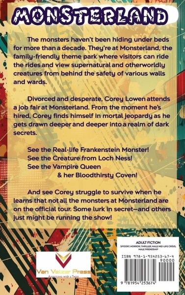 Adult-Age Novel: The monsters haven't been hiding under beds for more than a decade. They're at Monsterland, the family-friendly theme park where visitors can ride the rides and view supernatural and otherworldly creatures from behind the safety of various walls and wards. Divorced and desperate, Corey Lowen attends a job fair at Monsterland. From the moment he's hired, Corey finds himself in mortal jeopardy as he gets drawn deeper and deeper into a realm of dark secrets. See the Real-life Frankenstein Monster! See the Creature from Loch Ness! See the Vampire Queen and her Bloodthirsty Coven! And ... see Corey struggle to survive when he learns that not all the monsters at Monsterland are on the official tour. Some lurk in secret-and others just might be running the show!