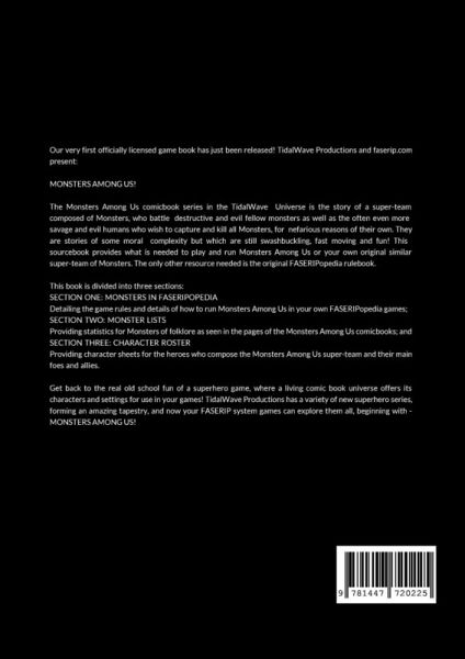 Our very first officially licensed game book has just been released! TidalWave Productions and faserip.com present: MONSTERS AMONG US! https://www.drivethrurpg.com/product/436095/Monsters-Among-Us MONSTERS AMONG US! The Monsters Among Us comicbook series in the TidalWave Universe is the story of a super-team composed of Monsters, who battle destructive and evil fellow monsters as well as the often even more savage and evil humans who wish to capture and kill all Monsters, for nefarious reasons of their own. They are stories of some moral complexity but which are still swashbuckling, fast moving and fun! This sourcebook provides what is needed to play and run Monsters Among Us or your own original similar super-team of Monsters. The only other resource needed is the original FASERIPopedia rulebook. This book is divided into three sections: SECTION ONE: MONSTERS IN FASERIPOPEDIA Detailing the game rules and details of how to run Monsters Among Us in your own FASERIPopedia games; SECTION TWO: MONSTER LISTS Providing statistics for Monsters of folklore as seen in the pages of the Monsters Among Us comicbooks; and SECTION THREE: CHARACTER ROSTER Providing character sheets for the heroes who compose the Monsters Among Us super-team and their main foes and allies. ... Get back to the real old school fun of a superhero game, where a living comic book universe offers its characters and settings for use in your games! TidalWave Productions has a variety of new superhero series, forming an amazing tapestry, and now your FASERIP system games can explore them all, beginning with - MONSTERS AMONG US!