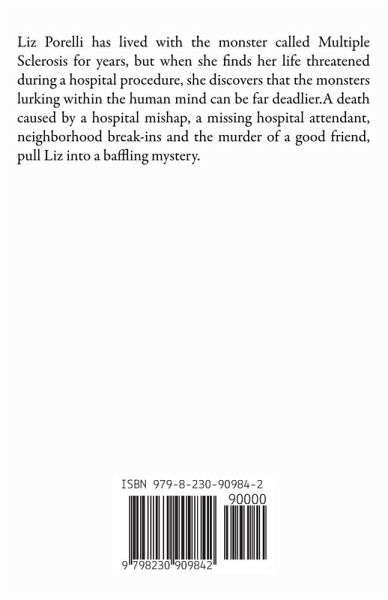 Liz Porelli has lived with the monster called Multiple Sclerosis for years, but when she finds her life threatened during a hospital procedure, she discovers that the monsters lurking within the human mind can be far deadlier.A death caused by a hospital mishap, a missing hospital attendant, neighborhood break-ins and the murder of a good friend, pull Liz into a baffling mystery.