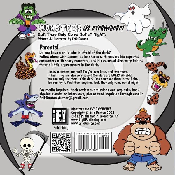 Monsters are EVERYWHERE! But, They Only Come Out at Night! I know monsters are real! They're over here, and over there. In fact, they are also very scary! Monsters are EVERYWHERE! You can only see them in the dark. You can't see them in the light. You can try to find them anytime, but, they only come out at night! -Erik Dunton Parents! Do you have a child who is afraid of the dark? Follow along with James, as he shares his repeated encounters with scary monsters, and his eventual discovery behind these nocturnal appearances in the dark. Monsters are EVERYWHERE! is the first of many adventures of James, his family, and friends. This series of children's picture books explores the social-emotional issues of the developing young child. The stories in these books will encourage empathy, kindness, and self-control while developing the emotional tools to understand feelings, such as grief, anger, fear, and pride. Monsters are EVERYWHERE! is the fifth children's picture book from Erik Dunton, (www.erikdunton.com) and Big E! Publishing (www.bigepublishing.com).