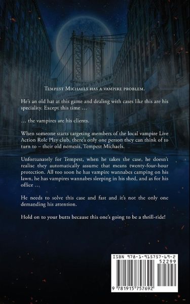 Tempest Michaels has a vampire problem. He's an old hat at this game and dealing with cases like this are his speciality. Except this time ... ... the vampires are his clients. When someone starts targeting members of the local vampire Live Action Role Play club, there's only one person they can think of to turn to - their old nemesis, Tempest Michaels. Unfortunately for Tempest, when he takes the case, he doesn't realise they automatically assume that means twenty-four-hour protection. All too soon he has vampire wannabes camping on his lawn, he has vampires wannabes sleeping in his shed, and as for his office ... He needs to solve this case and fast and it's not the only one demanding his attention. Hold on to your butts because this one's going to be a thrill-ride!