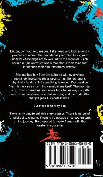 But caution yourself, reader. The inner minds of two families create death in this addictive psychological journey. Profound loss and hatred are explored to a depth unknown previously. Michael is a boy from the suburbs with everything seemingly intact. He plays sports, has friends, and is physically healthy. But something is wrong. The monster in his mind screeches and howls for a better way-a path away from abuse and scandal and murder, and the instability that plagues his adolescence. But there is no way out. There is no way to sell this story, reader. There is no belief for Michael to cling to. There is no escape once you embark on the journey. Be prepared to make friends with the monster in your mind. Throughout the adventure, your mind will seek resolution. Maybe a constructive way out. But the monster in your mind is the same one haunting the book itself, and it will lead you down paths you never thought of. If you go inside your mind, will you find a way out of your own maze?