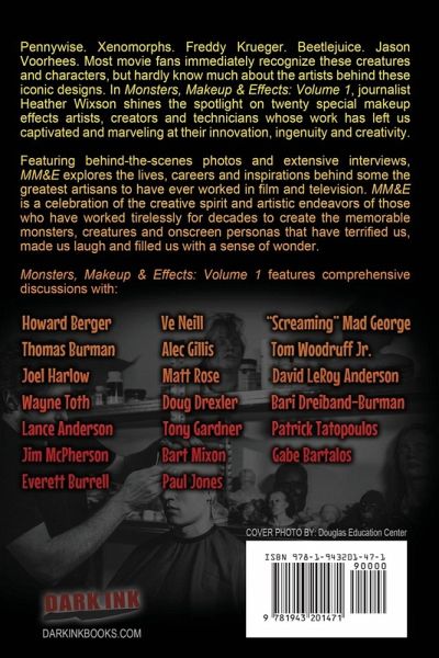 Pennywise. Xenomorphs. Freddy Krueger. Beetlejuice. Jason Voorhees. Most movie fans immediately recognize these creatures and characters, but hardly know much about the artists behind these iconic designs. In Monsters, Makeup & Effects: Volume 1, journalist Heather Wixson shines the spotlight on twenty special makeup effects artists, creators and technicians whose work has left us captivated and marveling at their innovation, ingenuity and creativity. Featuring behind-the-scenes photos and extensive interviews, MM&E explores the lives, careers and inspirations behind some the greatest artisans to have ever worked in film and television. MM&E is a celebration of the creative spirit and artistic endeavors of those who have worked tirelessly for decades to create the memorable monsters, creatures and onscreen personas that have terrified us, made us laugh and filled us with a sense of wonder. Monsters, Makeup & Effects: Volume 1 features comprehensive discussions with: Howard Berger Ve Neill "Screaming" Mad George Thomas Burman Alec Gillis Tom Woodruff Jr. Joel Harlow Matt Rose David LeRoy Anderson Bari Dreiband-Burman Doug Drexler Wayne Toth Lance Anderson Tony Gardner Patrick Tatopoulos Jim McPherson Bart Mixon Gabe Bartalos Paul Jones