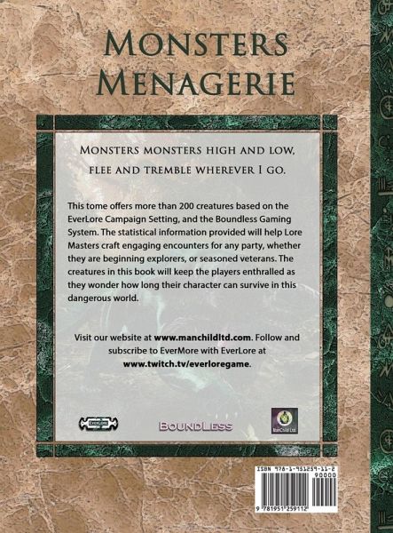 This tome is for Lore Masters, as it provides information on more than 200 creatures that are sure to provide a challenge for any party; whether they are seasoned veterans, or beginning adventurers taking to the road on the hunt for fun, treasure and conquest. EverLore is an interactive storytelling game that builds a solid foundation of devious monsters, nefarious factions, lost treasures and ancient powers upon which your imagination can soar without limits. This book is based on the EverLore Campaign Setting, and the BoundLess Gaming System, developed by David Thompson. This new system does not rely on levels or classes, so players can Game Without Boundaries.