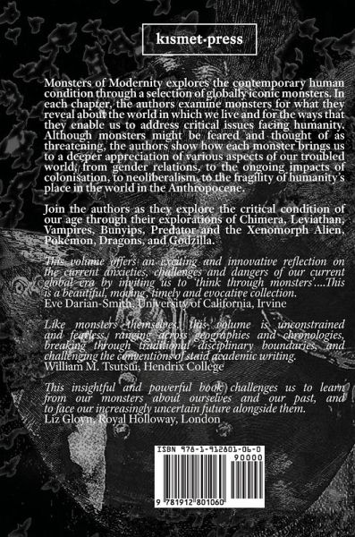 Julian C. H. Lee, Hariz Halilovich, Ani Landau-Ward, Peter Phipps, & Richard J. Sutcliffe Monsters of Modernity explores the contemporary human condition through a selection of globally iconic monsters. The authors explore diverse monsters for what they reveal about the world in which we live and for the ways that they enable us to address critical issues facing humanity. Although monsters might be feared and thought of as threatening, the authors show how each monster brings us to a deeper appreciation of various aspects of our troubled world, from gender relations, to the ongoing impacts of colonisation, to neoliberalism, to the fragility of humanity’s place in the world in the Anthropocene. Monsters of Modernity explores new ground in the conventions of authorship and scholarship, and will be a valuable companion to anyone interested in the study of monsters as well as those seeking engaging ways to explore and teach key global issues. Join the authors as they explore the critical condition of our age through their explorations of Chimera, Leviathan, Vampires, Bunyips, Predator and the Xenomorph Alien, Pokémon, Dragons, and Godzilla. Authors Julian C.H. Lee is Associate Professor in Global Studies at RMIT University, Australia. He is the author of a number of books including Policing Sexuality: Sex, Society and the State; Second Thoughts: On Globalisation, Malaysia, Society and Self; and Women’s Activism in Malaysia.. Ani Landau-Ward is associated with the Social and Global Studies Centre and the Centre for Urban Research at RMIT University. Her scholarly writing has been published in the Springer Global Encyclopedia of Public Administration, Public Policy, and Governance; the New Zealand Journal of Asian Studies, and the volume Urban Asias: Essays on Futurity Past and Present. Hariz Halilovich is an award-winning social anthropologist and author; he is Associate Professor and Vice-Chancellor’s Senior Research Fellow at the Social and Global Studies Centre, RMIT University, Melbourne. His main research areas include place-based identity politics, forced migration, politically motivated violence, memory studies and human rights. Peter Phipps is a Senior Lecturer in Global Studies at RMIT University, where he is also associated with the Social and Global Studies Centre. He has published in journals including Ethnos, Alternatives, and Communication, Politics and Culture on Indigenous festivals, commemorations, tourism and the politics of cultural globalization. Richard J. Sutcliffe is an independent researcher who has conducted research on new religious movements and urban youth culture. His writing has been published in places including the journal Canberra Anthropology, and in the volumes Paganism Today, Managing Modernity in the Western Pacific, The Malaysian Way of Life, Second Thoughts: On Malaysia, Globalisation, Society and Self, and the Springer Global Encyclopedia of Public Administration, Public Policy, and Governance. Contents I) Here Be Dragons II) The Functional Autonomy of Monsters — A Metalogue III) Polymorphous Monstrosity: Some Chimerical Reflections on the Question — What Is a Monster? IV) The Bunyip, and Other Australian Monsters V) Leviathan, the Sovereign VI) Is Alien to Predator as Nature Is to Culture? VII) Vampires and Ratko Mladi¿: Balkan Monsters and the Monstering of People VIII) Pokémon Reaping IX) Godzilla, The Unmocked God Authorship, Acknowledgements, and Other Notes Not Elsewhere Well-Accommodated