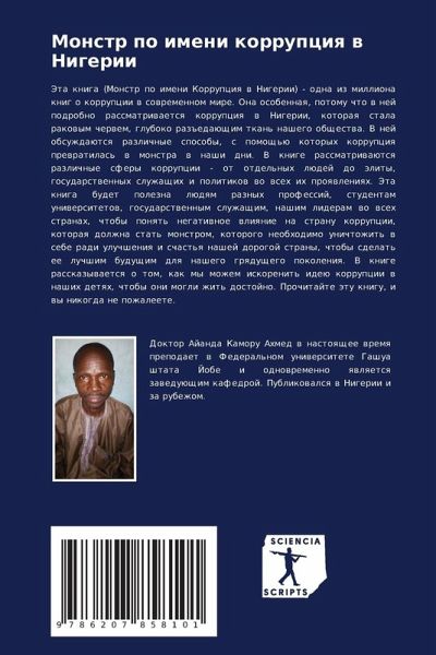 Jeta kniga (Monstr po imeni Korrupciq w Nigerii) - odna iz milliona knig o korrupcii w sowremennom mire. Ona osobennaq, potomu chto w nej podrobno rassmatriwaetsq korrupciq w Nigerii, kotoraq stala rakowym cherwem, gluboko raz#edaüschim tkan' nashego obschestwa. V nej obsuzhdaütsq razlichnye sposoby, s pomosch'ü kotoryh korrupciq prewratilas' w monstra w nashi dni. V knige rassmatriwaütsq razlichnye sfery korrupcii - ot otdel'nyh lüdej do älity, gosudarstwennyh sluzhaschih i politikow wo wseh ih proqwleniqh. Jeta kniga budet polezna lüdqm raznyh professij, studentam uniwersitetow, gosudarstwennym sluzhaschim, nashim lideram wo wseh stranah, chtoby ponqt' negatiwnoe wliqnie na stranu korrupcii, kotoraq dolzhna stat' monstrom, kotorogo neobhodimo unichtozhit' w sebe radi uluchsheniq i schast'q nashej dorogoj strany, chtoby sdelat' ee luchshim buduschim dlq nashego grqduschego pokoleniq. V knige rasskazywaetsq o tom, kak my mozhem iskorenit' ideü korrupcii w nashih detqh, chtoby oni mogli zhit' dostojno. Prochitajte ätu knigu, i wy nikogda ne pozhaleete.