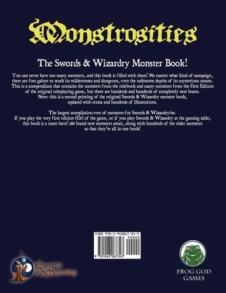 Swords & Wizardry Monster Book! You can never have too many monsters, and this book is filled with them! No matter what kind of campaign, there are foes galore to stock its wildernesses and dungeons, even the unknown depths of its mysterious oceans. This is a compendium that contains the monsters from the rulebook and many monsters from the First Edition of the original roleplaying game, but there are hundreds and hundreds of completely new beasts. Note: this is a second printing of the original Swords & Wizardry monster book, updated with errata and hundreds of illustrations. The largest compilation ever of monsters for Swords & Wizardry/0e. If you play the very first edition (0e) of the game, or if you play Swords & Wizardry at the gaming table, this book is a must-have! 186 brand new monsters await, along with hundreds of the older monsters so that they're all in one book.! Monstrosities was created with the generous help of the Swords & Wizardry internet community, as you can see from the list of unusually brilliant authors whose erudition and eloquence grace these pages. The book's successes are due to them, whilst any errors or failures in the transcription of their noble work are doubtless my own.