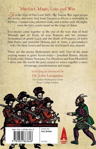 Mischief, Magic, Love and War. It is the Year of Our Lord 1601. The Tuscan War rages across the world, and every lord from Navarre to Illyria is embroiled in the fray. Cannon roar, pikemen clash, and witches stalk the night; even the fairy courts stand on the verge of chaos. Five stories come together at the end of the war: that of bold Miranda and sly Puck; of wise Pomona and her prisoner Vertumnus; of gentle Lucia and the shade of Prospero; of noble Don Pedro and powerful Helena; and of Anne, a glovemaker's wife. On these lovers and heroes the world itself may depend. These are the stories Shakespeare never told. Five of the most exciting names in genre fiction today - Jonathan Barnes, Adrian Tchaikovsky, Emma Newman, Foz Meadows and Kate Heartfield - delve into the world the poet created to weave together a story of courage, transformation and magic. Including an afterword by Dr. John Lavagnino, The London Shakespeare Centre, King's College London.