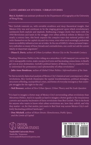 The birth of the world's great megacities is the surest and starkest harbinger of the "urban age" inaugurated in the twentieth century. As the world's urban population achieves majority for the first time in recorded history, theories proliferate on the nature of urban politics, including the shape and quality of urban democracy, the role of urban social and political movements, and the prospects for progressive and emancipatory change from the corridors of powerful states to the routinized rhythms of everyday life. At stake are both the ways in which the rapidly changing urban world is understood and the urban futures being negotiated by the governments and populations struggling to contend with these changes and forge a place in contemporary cities. Transdisciplinary by design, Monstrous Politics first moves historically through Mexico City's turbulent twentieth century, driven centrally by the contentious imbrication of the Institutional Revolutionary Party (PRI) and its capital city. Participant observation, expert interviews, and archival materials demonstrate the shifting strategies and alliances of recent decades, provide the reader with a sense of the texture of contemporary political life in the city during a time of unprecedented change, and locate these dynamics within the history and geography of twentieth-century urbanization and political revolution. Substantive ethnographic chapters trace the emergence and decline of the political language of "the right to the city," the establishment and contestation of a "postpolitical" governance regime, and the culmination of a century of urban politics in the processes of "political reform" by which Mexico City finally wrested back significant political autonomy and local democracy from the federal state. A four-fold transection of the revolutionary structure of feeling that pervades the city in this historic moment illustrates the complex and contradictory sentiments, appraisals, and motivations through which contemporary politics are understood and enacted. Drawing on theories of social revolution that embrace complexity, and espousing a methodology that foregrounds the everyday nature of politics, Monstrous Politics develops an understanding of revolutionary urban politics at once contextually nuanced and conceptually expansive, and thus better able to address the realities of politics in the "urban age" even beyond Mexico City.