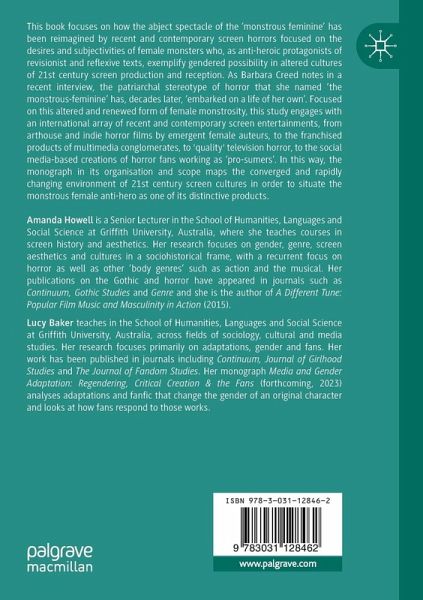 This book focuses on how the abject spectacle of the 'monstrous feminine' has been reimagined by recent and contemporary screen horrors focused on the desires and subjectivities of female monsters who, as anti-heroic protagonists of revisionist and reflexive texts, exemplify gendered possibility in altered cultures of 21st century screen production and reception. As Barbara Creed notes in a recent interview, the patriarchal stereotype of horror that she named 'the monstrous-feminine' has, decades later, 'embarked on a life of her own'. Focused on this altered and renewed form of female monstrosity, this study engages with an international array of recent and contemporary screen entertainments, from arthouse and indie horror films by emergent female auteurs, to the franchised products of multimedia conglomerates, to 'quality' television horror, to the social media-based creations of horror fans working as 'pro-sumers'. In this way, the monograph in its organisation and scope maps the converged and rapidly changing environment of 21st century screen cultures in order to situate the monstrous female anti-hero as one of its distinctive products.