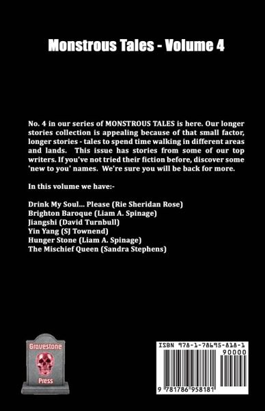No. 4 in our series of MONSTROUS TALES is here. Our longer stories collection is appealing because of that small factor, longer stories - tales to spend time walking in different areas and lands. This issue has stories from some of our top writers. If you've not tried their fiction before, discover some 'new to you' names. We're sure you will be back for more. In this volume we have: - Drink My Soul... Please (Rie Sheridan Rose) Brighton Baroque (Liam A. Spinage) Jiangshi (David Turnbull) Yin Yang (SJ Townend) Hunger Stone (Liam A. Spinage) The Mischief Queen (Sandra Stephens)