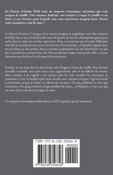 De l'auteur d'Alaska Wild vient un suspense romantique autonome qui vous coupera le souffle. Une romance brûlante, une tension à couper le souffle et un héros et une héroïne pour lesquels vous vous enracinerez jusqu'au bout. Prenez votre exemplaire, tout de suite ! Le docteur Dominic Corrigan. Il est tatoué, arrogant et magnifique, avec des cicatrices de balles dues à son travail dans des zones de guerre. Je suis une chirurgienne geek qui se cache dans le calme de son bloc opératoire. Nous ne pourrions pas être plus différents, mais dès la seconde où nous nous rencontrons, il me poursuit... et quand je regarde dans ses yeux bleus, je suis perdue. Mais je connais sa réputation et je suis déterminée à ne pas être sa prochaine aventure d'un soir. Puis un désastre frappe notre petite ville... et nous devenons tous les deux le seul espoir de nos patients. Soudain, je suis jetée dans le chaos d'une salle d'urgence à bout de souffle. Nous devons travailler ensemble, mais plus nous nous rapprochons, plus il est difficile de résister. Nous sommes à un regard, à un contact près de nous arracher les vêtements. Je commence à voir la douleur qu'il cache derrière son extérieur arrogant. Qu'est-il arrivé à cet homme, et puis-je l'aider à se libérer de son passé ? Et nos problèmes ne font que commencer. Un gang criminel compte profiter du chaos... et l'hôpital, et tous ceux qui me sont chers, sont dans leur ligne de mire. Un suspense romantique indépendant, un HEA garanti, pas de tromperie.