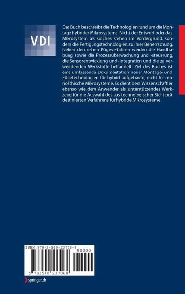 Das Buch beschreibt die Technologien rund um die Montage hybrider Mikrosysteme. Nicht der Entwurf oder das Mikrosystem als solches stehen im Vordergrund, sondern die Fertigungstechnologien zu ihrer Beherrschung. Neben den reinen Fügeverfahren werden die Handhabung sowie die Prozessüberwachung und -steuerung, die Sensorentwicklung und -integration und die zu verwendenden Werkstoffe behandelt. Ziel des Buches ist eine umfassende Dokumentation neuer Montage- und Fügetechnologien für hybrid aufgebaute, nicht für monolithische Mikrosysteme. Es dient dem Wissenschaftler ebenso wie dem Anwender als unterstützendes Werkzeug für die Auswahl des aus technologischer Sicht prädestinierten Verfahrens für hybride Mikrosysteme.