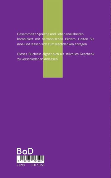 Gesammelte Sprüche und Lebensweisheiten kombiniert mit harmonischen Bildern. Halten Sie inne und lassen sich zum Nachdenken anregen. Dieses Büchlein eignet sich als stilvolles Geschenk zu verschiedenen Anlässen.