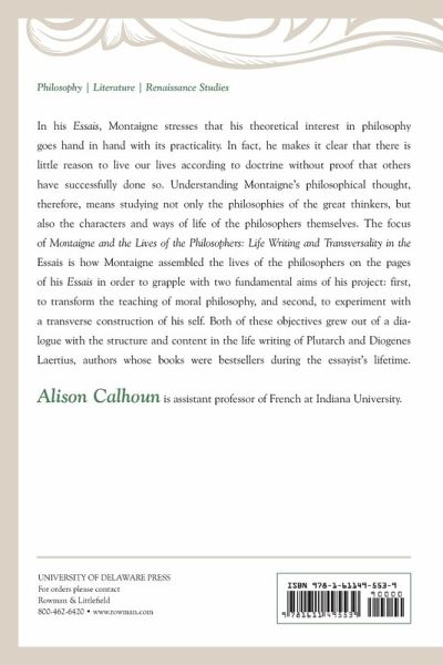 This book rethinks Montaigne's philosophical thought in terms of transversality by investigating the essayist's debt to ancient life writers Diogenes Laertius and Plutarch. Its scope is of interest to scholars of ancient and early modern life writing, ancient and early modern philosophy, as well as scholars of early modern literary history.