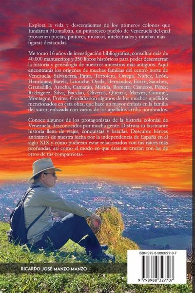 Explora la vida y descendientes de los primeros colonos que fundaron Montalbán, un pintoresco pueblo de Venezuela del cual provienen poetas, pintores, músicos, intelectuales y muchas más figuras destacadas. Me tomó 16 años de investigación bibliográfica, consultar más de 40.000 manuscritos y 350 libros históricos para poder desenterrar la historia y genealogía de nuestros ancestros más antiguos. Aquí encontrarás los orígenes de muchas familias del centro norte de Venezuela. Salvatierra, Pinto, Tortolero, Ortega, Núñez, León, Henríquez, Barela, Latouche, Ojeda, Hernández, Ecarri, Sánchez, Granadillo, Arocha, Camarán, Mérida, Romero, Cisneros, Pérez, Rodríguez, Silva, Bacalao, Oliveros, Qüenza, Marvéz, Coronel, Montagne, Freites, Cordido son algunos de los muchos apellidos mencionados en esta obra, que hace un mayor énfasis en la familia del autor, enlazada con varios de los apellidos arriba nombrados. Conoce algunos de los protagonistas de la historia colonial de Venezuela, desconocidos por mucha gente. Disfruta su fascinante historia llena de viajes, conquistas y batallas. Descubre héroes anónimos de nuestra lucha por la independencia de España en el siglo XIX y cómo pudieran estar relacionados con tus raíces más profundas, así como el modo en que éstas se cruzan con las de otros de tus compatriotas.