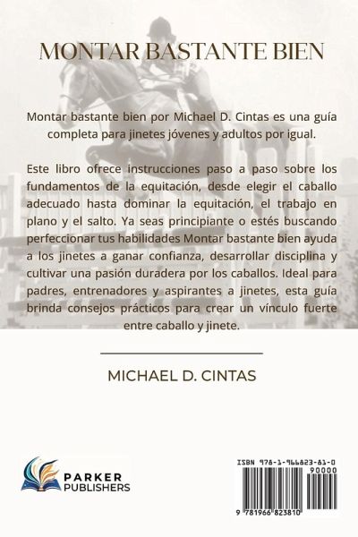 Montar bastante bien por Michael D. Cintas es una guía completa para jinetes jóvenes y adultos por igual. Este libro ofrece instrucciones paso a paso sobre los fundamentos de la equitación, desde elegir el caballo adecuado hasta dominar la equitación, el trabajo en plano y el salto. Ya seas principiante o estés buscando perfeccionar tus habilidades Montar bastante bien ayuda a los jinetes a ganar confianza, desarrollar disciplina y cultivar una pasión duradera por los caballos. Ideal para padres, entrenadores y aspirantes a jinetes, esta guía brinda consejos prácticos para crear un vínculo fuerte entre caballo y jinete.