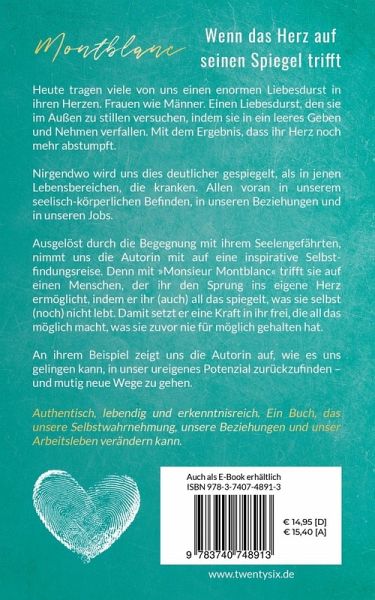 Heute tragen viele von uns einen enormen Liebesdurst in ihren Herzen. Frauen wie Männer. Einen Liebesdurst, den sie im Außen zu stillen versuchen, indem sie in ein leeres Geben und Nehmen verfallen. Mit dem Ergebnis, dass ihr Herz noch mehr abstumpft. Nirgendwo wird uns dies deutlicher gespiegelt als in jenen Lebensbereichen, die kranken. Allen voran in unserem seelisch-körperlichen Befinden, in unseren Beziehungen und unseren Jobs.Ausgelöst durch die Begegnung mit ihrem (Dual-)Seelengefährten, nimmt uns die Autorin mit auf eine inspirative Selbstfindungsreise. Denn mit "Monsieur Montblanc" trifft sie auf einen Menschen, der ihr den Sprung ins eigene Herz ermöglicht, indem er ihr (auch) all das spiegelt, was sie selbst (noch) nicht lebt. Damit setzt er eine Kraft in ihr frei, die all das möglich macht, was sie zuvor nie für möglich gehalten hat. An ihrem Beispiel zeigt uns die Autorin auf, wie es uns gelingen kann, in unser ureigenes Potenzial zurückzufinden und mutig neue Wege zu gehen. Es ist ein Buch, das von einer einzigartigen Seelenverbundenheit und den tiefgreifenden Erfahrungen erzählt, die der Weg der Selbstliebe bereithält. Ein Buch, das unsere Selbstwahrnehmung, unsere Beziehungen und unser Arbeitsleben verändern kann, sofern wir bereit dafür sind und es zulassen.