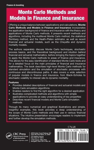 This book takes a straightforward line to discuss Monte Carlo experiments with financial and insurance applications, offering a step-by-step approach to Monte Carlo methods with extensive description of the algorithms required. ... this book includes a rigorous and concise description of numerous financial models and offers an up-to-date survey of this literature. This thorough book can be seen as a handbook on Monte Carlo methods and models for practitioners in finance and can be used in graduate courses on simulation models, numerical methods, financial mathematics, actuarial models and financial econometrics. It is certainly a toolkit of models and their corresponding Monte Carlo algorithms for practitioners and researchers in finance and insurance.