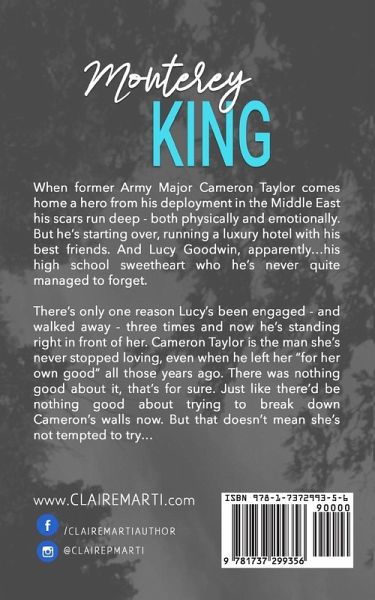 A grumpy scarred veteran. A sunny wedding planner. A second chance at love? When former Army Major Cameron Taylor comes home a hero from his deployment in the Middle East his scars run deep - both physically and emotionally. But he's starting over, running a luxury hotel with his best friends. And Lucy Goodwin, apparently...his high school sweetheart who he's never quite managed to forget. There's only one reason Lucy's been engaged - and walked away - three times and now he's standing right in front of her. Cameron Taylor is the man she's never stopped loving, even when he left her "for her own good" all those years ago. There was nothing good about it, that's for sure. Just like there'd be nothing good about trying to break down Cameron's walls now. But that doesn't mean she's not tempted to try... ***Monterey King is the third book in award-winning and USA Today bestselling author Claire Marti's spin off contemporary romance series, California Suits. The series follows the adventures of five best friends who are opening a string of luxury boutique hotels from La Jolla to Monterey to Beverly Hills as each one finds true love...usually where he least expects it. Each book is a standalone.