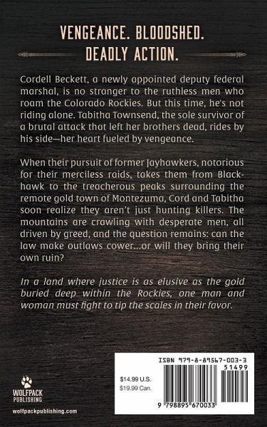 VENGEANCE. BLOODSHED. DEADLY ACTION. Cordell Beckett, a newly appointed deputy federal marshal, is no stranger to the ruthless men who roam the Colorado Rockies. But this time, he's not riding alone. Tabitha Townsend, the sole survivor of a brutal attack that left her brothers dead, rides by his side-her heart fueled by vengeance. When their pursuit of former Jayhawkers, notorious for their merciless raids, takes them from Blackhawk to the treacherous peaks surrounding the remote gold town of Montezuma, Cord and Tabitha soon realize they aren't just hunting killers. The mountains are crawling with desperate men, all driven by greed, and the question remains: can the law make outlaws cower...or will they bring their own ruin? In a land where justice is as elusive as the gold buried deep within the Rockies, one man and woman must fight to tip the scales in their favor.