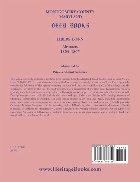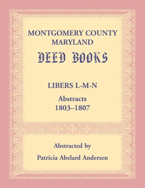 This volume presents abstracts taken from Montgomery County, Maryland, Deed Books: Liber L, Liber M, and Liber N, 1803-1807. In these abstracts you may find interesting aspects of your ancestors' lives. Entries generally contain the full name of the person recording the item and the date, the full name(s) of the seller(s) and the purchaser(s) involved in the sale, the sold amount, and a description of the item sold. Descriptions for land typically include location and number of acres. Descriptions for property typically include a list of items sold. Descriptions for slaves typically include the name and age of the slave. Entries offer varying amounts of additional information as available. The deed books contain many non-land items, including information about slave sales and manumissions, as well as mortgages of both real and personal (chattel) property. Occasionally, other documents are also recorded, such as bills of sale, which often contain the names of family members. In addition to Montgomery County, Maryland, this volume contains abstracts for the District of Columbia. An index to full-names, an index to town lots and other place names, and an index to land tract names add to the value of this work.
