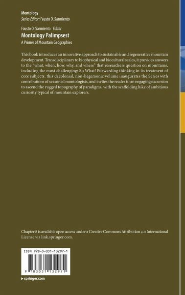 This book introduces an innovative approach to sustainable and regenerative mountain development. Transdisciplinary to biophysical and biocultural scales, it provides answers to the "what, when, how, why, and where" that researchers question on mountains, including the most challenging: So What! Forwarding thinking in its treatment of core subjects, this decolonial, non-hegemonic volume inaugurates the Series with contributions of seasoned montologists, and invites the reader to an engaging excursion to ascend the rugged topography of paradigms, with the scaffolding hike of ambitious curiosity typical of mountain explorers.