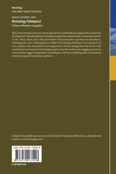 This book introduces an innovative approach to sustainable and regenerative mountain development. Transdisciplinary to biophysical and biocultural scales, it provides answers to the "what, when, how, why, and where" that researchers question on mountains, including the most challenging: So What! Forwarding thinking in its treatment of core subjects, this decolonial, non-hegemonic volume inaugurates the Series with contributions of seasoned montologists, and invites the reader to an engaging excursion to ascend the rugged topography of paradigms, with the scaffolding hike of ambitious curiosity typical of mountain explorers.