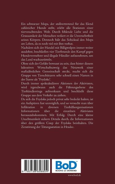 Ein schwarzer Mops, der stellvertretend für das Elend zahlreicher Hunde steht, erlebt alle Stationen einer tierverachtenden Welt. Durch fehlende Liebe und die Grausamkeit der Menschen verliert er die Unversehrtheit seines Körpers. Dennoch hält das Schicksal den Mops am Leben, da es noch viel mit ihm vorhat.Nachdem sich der Handel mit Billigwelpen immer weiter ausdehnt, beschließen vier Tierfreunde den Kampf gegen Hundevermehrer und illegale Händler aufzunehmen, um das Land wachzurütteln. Ohne sich der Gefahr bewusst zu sein, dass hinter diesem lukrativen Wirtschaftszweig das Netzwerk einer mafiaähnlichen Gemeinschaft steckt, macht sich die Gruppe von Tierschützern sehr schnell einen Namen in der Szene als "Frydoks".Durch immer spektakulärere Aktionen der Aktivisten, wird irgendwann auch die Führungsebene des Tierhändlerrings aufmerksam und beschließt diese Gruppe aus dem Verkehr zu ziehen. Da sich die Frydoks jedoch privat sehr bedeckt halten, ist ein Aufspüren fast unmöglich, und so versucht man über Infiltration in diversen Tierhilfsorganisationen Informationen über die einzelnen Aktivisten herauszubekommen. Mit Erfolg. Durch eine kleine Unachtsamkeit sickern Details durch, die Informationen über den größten Coup der Frydoks beinhalten. Die Zerstörung der Tötungsstation in Hradec.