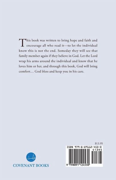 This book was written to bring hope and faith and encourage all who read it--to let the individual know this is not the end. Someday they will see that family member again if they believe in God. Let the Lord wrap his arms around the individual and know that he loves him or her, and through this book, God will bring comfort... God bless and keep you in his care.