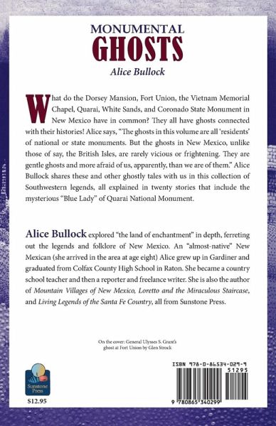 What do the Dorsey Mansion, Fort Union, the Vietnam Memorial Chapel, Quarai, White Sands, and Coronado State Monument in New Mexico have in common? They all have ghosts connected with their histories! Alice says, "The ghosts in this volume are all 'residents' of national or state monuments. But the ghosts in New Mexico, unlike those of say, the British Isles, are rarely vicious or frightening. They are gentle ghosts and more afraid of us, apparently, than we are of them." Alice Bullock shares these and other ghostly tales with us in this collection of Southwestern legends, all explained in twenty stories that include the mysterious "Blue Lady" of Quarai National Monument. * ** * * Alice Bullock explored "the land of enchantment" in depth, ferreting out the legends and folklore of New Mexico. An "almost-native" New Mexican (she arrived in the area at age eight) Alice grew up in Gardiner and graduated from Colfax County High School in Raton. She became a country school teacher and then a reporter and freelance writer. She is also the author of "Mountain Villages of New Mexico," "Loretto and the Miraculous Staircase," and "Living Legends of the Santa Fe Country," all from Sunstone Press.