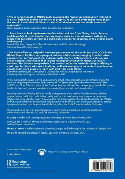 Dedication Foreword Preface Chapter 1. MOOCs and Open Education in the Global South: Successes and Challenges Section 1: Historical Perspectives Chapter 2. An Historical Journey into K-MOOCs Leading to Possible Collaborations with North Korea Chapter 3. Current State of Practice and Research on MOOCs in Mainland China: A Critical Review Section 2: Current Practices and Designs Chapter 4. The Different Faces of Open in Egypt Chapter 5. Delivering on the Promise of Open Educational Resources: Pitfalls and Strategies Chapter 6. Massive Online Open Courses: The State of Practice in Indonesia Chapter 7. Orchestrating Shifts in Perspectives and Practices about the Design of MOOCs Chapter 8. A Different Kind of MOOC Architecture for Emerging Economies in Oceania and the Pacific Chapter 9. Nepali High School Students in Massive Open Online Courses (MOOCs): Impressive Results and a Promising Future Chapter 10. MOOCs in Latin America: Trends and Issues Chapter 11. The Emotional Benefits of Diversity in MOOCs: Reshaping Views of Online Education Through Exposure to Global Learners Section 3: MOOCs and Open Education for Professional Development Chapter 12. Insights into a Nationwide pdMOOC portal: Bilgeis.net of Turkey Chapter 13. Promoting Open Education and MOOCs in Thailand: A Research Based Design Approach Chapter 14. Capacity Building of Teachers: A Case Study of the Technology-Enabled Learning (TEL) Massive Open Online Courses Chapter 15. The Development of MOOCs as Incubation Space for Professional and Institutional Learning: A View from South Africa Section 4: Multi-Country Collaborations and Collections Chapter 16. Courses for a Cause: MOOC Contributions to a "Better Place for All" Chapter 17. MOOCs in Six Emerging APEC Member Economies: Trends, Research and Recommendations Chapter 18. A Glimpse on How MOOCs from IDB are Impacting Learners in Latin America and the Caribbean Section 5: Government Policies and Strategies Chapter 19. Advancing Open Education Policy in Brazilian Higher Education Chapter 20. Global Trends and Policy Strategies and their Implications for the Sustainable Development of MOOCs in Malaysia Chapter 21. OERs for Development (OERs4D) Framework as Designed and Implemented in the Philippines Chapter 22. Disruptive Learning: Inspiring the Advancement of MOOCs in the Middle East Section 6: Organizational Innovations Chapter 23. Open Education at the World Bank: A Significant Dividend for Development Chapter 24. From OER to OEP: The case of an OER-integrated teacher education eLearning program in Africa Chapter 25. Responsive innovations in MOOCs for Development: A case study of AgMOOCs in India Chapter 26. Implementing a Skills Accelerator to Prepare Students in Kenya for Online-Only Bachelors and MBA Programs that Require MOOCs and OER: A Case Study Section 7: The Future of MOOCs and Open Education Chapter 27. Evolution of Online Learning Environments and the Emergence of Intelligent MOOCs Chapter 28. MOOCs and Open Education in the Global South: Future Opportunities Acknowledgments