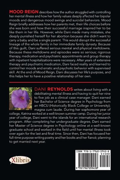 Mood Reign describes how the author struggled with controlling her mental illness and how her family values deeply affected her bipolar moods and dangerous mood swings and suicidal behaviors. Mood Reign briefly addresses how her parents met, their life choices before she was born and how their successful marriage inspired her to be like them in her life. However, while Dani made many mistakes, she deeply punished herself for her abortion because she didn't want to carry a baby and be a single parent. This would disrupt the successful lineage of the whole family in her immediate family dynasty. Because of this guilt, Dani suffered serious mental and physical meltdowns. Because these meltdowns and episodes were so serious; rigorous therapy, medication and psychiatric appointments and group therapy with inpatient hospitalizations were necessary. After years of extensive therapy and psychiatric medication, Dani faced reality and learned to control her moods and erratic and psychotic behavior with supervised skill. At the end of Mood Reign, Dani discusses her life's purpose, and this helps her to have a positive relationship of her own.