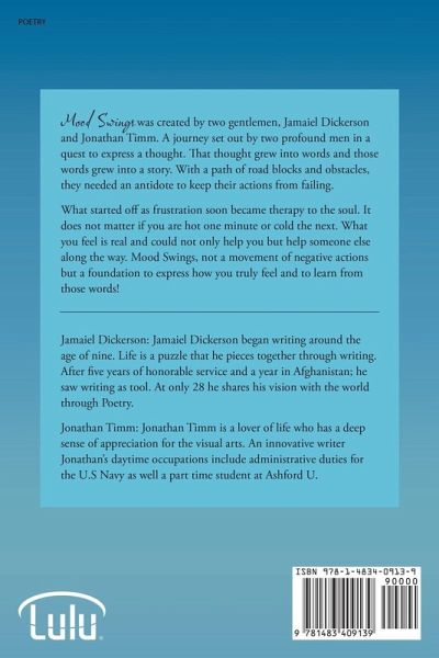 Mood Swings was created by two gentlemen, Jamaiel Dickerson and Jonathan Timm. A journey set out by two profound men in a quest to express a thought. That thought grew into words and those words grew into a story. With a path of road blocks and obstacles, they needed an antidote to keep their actions from failing. What started off as frustration soon became therapy to the soul. It does not matter if you are hot one minute or cold the next. What you feel is real and could not only help you but help someone else along the way. Mood Swings, not a movement of negative actions but a foundation to express how you truly feel and to learn from those words!