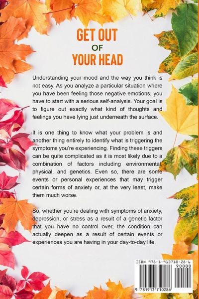 Understanding your mood and the way you think is not easy. As you analyze a particular situation where you have been feeling those negative emotions, you have to start with a serious self-analysis. Your goal is to figure out exactly what kind of thoughts and feelings you have lying just underneath the surface. It is one thing to know what your problem is and another thing entirely to identify what is triggering the symptoms you're experiencing. Finding these triggers can be quite complicated as it is most likely due to a combination of factors including environmental, physical, and genetics. Even so, there are some events or personal experiences that may trigger certain forms of anxiety or, at the very least, make them much worse. So, whether you're dealing with symptoms of anxiety, depression, or stress as a result of a genetic factor that you have no control over, the condition can actually deepen as a result of certain events or experiences you are having in your day-to-day life. In "Get Out Of Your Head" You Will Learn: ¿ What Changes Thought Patterns and Belief Systems ¿ How it Works on Anxiety and Depression ¿ How CBT Helps With Problem-Solving In Depression or Anxiety ¿ Common Causes of Mood Disorders ¿ Understanding Your Moods and the Way You Think ¿ How to Diagnose Your Negative Thought Patterns ¿ Identifying Your Triggers for Anxiety and Stress ¿ How To Counter Negative and Angry Feelings ¿ Deal With Feelings of Guilt ¿ What Does Good Self-Care Look Like? ¿ Taking Responsibility for Your Happiness ¿ Becoming Assertive With Others ¿ How To Identify the Triggers, Fears, and Problematic Behavior ¿ To Dissociate From the Negative Thought Patterns ¿ Practice Mindfulness And so much more! Pick up your copy of the book right now by clicking the BUY NOW button at the top of this page!