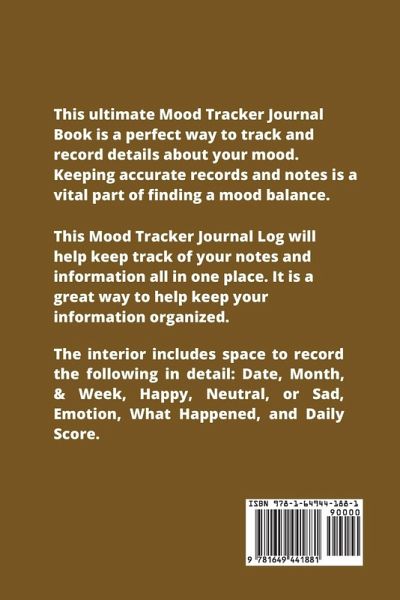 This Mood Tracker Log will make a perfect way for you to keep track of your mental and emotional wellbeing. It will help you monitor your moods every day. As you write your important details you will begin to see patterns that may help you in coping with your mental health levels. Each interior page of this notebook include space and prompts for weekly tracking the following: Date, Month & Week - For writing the date, which month, and the week of. Happy, Neutral, or Sad - Each day you can record for the morning, the afternoon, and the evening whether you were mostly happy, neutral, or sad. Emotion - Log the emotion that you felt. What Happened - Write your notes on what happened to give you that emotion, any gratitude you have, any symptoms, quotes for the day, things that happened, your energy, any feeling you experience, any pain medication you take, etc. Daily Score - Rate your mood level for your overall day, from 1-5 stars. Also makes a great gift for anyone you want to track their mood. Designed as a mood journal. Journals and logs are a beautiful way to keep all your important information all in one convenient place. Simple and easy to use. Size is 6x9 inches, white paper, black ink, 110 pages, soft matte finish cover, paperback. Get your copy today!