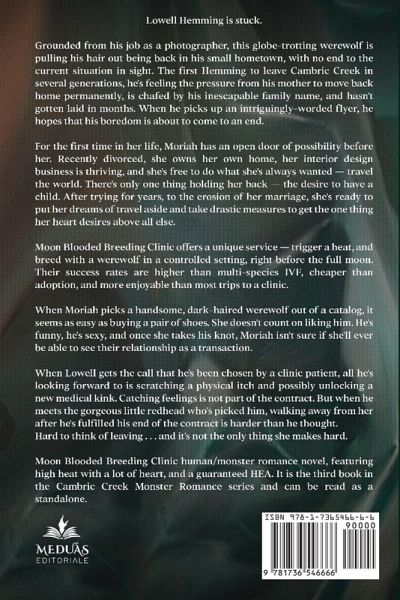 Moon Blooded Breeding Clinic offers a unique service - trigger a heat, and breed with a werewolf in a controlled setting, right before the full moon. Their success rates are higher than multi-species IVF, cheaper than adoption, and more enjoyable than most trips to a clinic. When Moriah picks a handsome, dark-haired werewolf out of a catalog, it seems as easy as buying a pair of shoes. She doesn't count on liking him. He's funny, he's sexy, and once she takes his knot, Moriah isn't sure if she'll ever be able to see their relationship as a transaction. When Lowell gets the call that he's been chosen by a clinic patient, all he's looking forward to is scratching a physical itch and possibly unlocking a new medical kink. Catching feelings is not part of the contract. But when he meets the gorgeous little redhead who's picked him, walking away from her after he's fulfilled his end of the contract is harder than he thought. Hard to think of leaving . . . and it's not the only thing she makes hard.