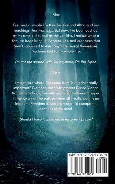 Alex I've lived a simple life thus far. I've had Altha and her teachings. Her warnings. But now, I've been cast out of my simple life, and as the veil lifts, I realize what a fog I've been living in. Secrets, lies, and creatures that aren't supposed to exist anymore reveal themselves. I've been lied to my whole life. I'm not the scared little kid anymore, I'm the Alpha. Vera I'm not sure where I've come from, but is that really important? I've been raised to protect Prince Viccar. Not with my body, but with my mind. I've been trapped in the luxury of the palace when all I really want is my freedom. Freedom to see the world. To escape the confines of my mind. Should I have just stayed in my pretty prison?