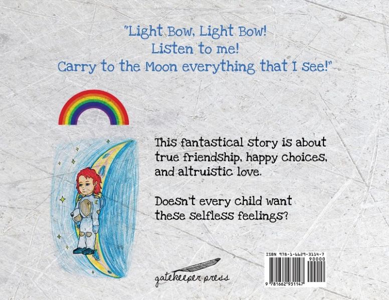 The first child born on the Moon meets a light bow who becomes his friend. With Moon magic, the light bow takes the child to Planet Earth to discover what might make this special child happy. They visit a beach, a mountain, a desert, a forest, a farmland, and a jungle. Natural places make the child happy. There is a place where the moon child becomes sad. What is different about such a place? What will he do with all these things that make him happy and what must he do with the place that makes him sad? This fantastical story is about true friendship, making choices, feeling happiness and sadness.