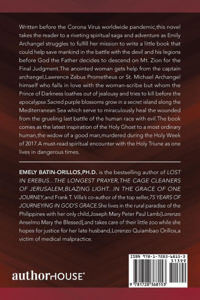 Written before the Corona Virus worldwide pandemic,this novel takes the reader to a riveting spiritual saga and adventure as Emily Archangel struggles to fulfill her mission to write a little book that could help save mankind in the battle with the devil and his legions before God the Father decides to descend on Mt. Zion for the Final Judgment.The anointed woman gets help from the captain archangel,Lawrence Zebus Prometheus or St. Michael Archangel himself who falls in love with the woman-scribe but whom the Prince of Darkness loathes out of jealousy and tries to kill before the apocalypse.Sacred purple blossoms grow in a secret island along the Mediterranean Sea which serve to miraculously heal the wounded from the grueling last battle of the human race with evil.The book comes as the latest inspiration of the Holy Ghost to a most ordinary human,the widow of a good man,murdered during the Holy Week of 2017.A must-read spiritual encounter with the Holy Triune as one lives in dangerous times.